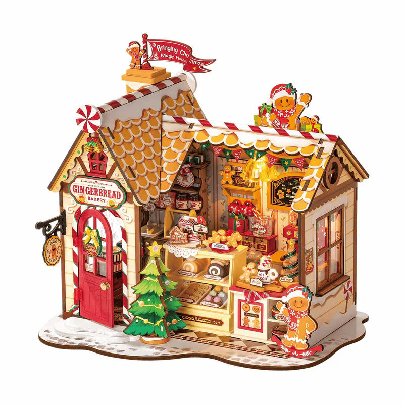 Rolife elevates your DIY assembly experience with a grand Christmas miniature house of sugary sweets and traditional treats you can display anywhere. The warmly lit Gingerbread House DG176 is filled with various cakes, cookies, bottles of jam, log rolls, chocolates, hot cocoa mixes, and other desserts that keep customers queuing and satisfied. More than just the stocked shelves, the shop itself is a joy to see with its frosted scallop roof, candy cane trim, red and green bunting, gingerbread man signage, and red door. In front is a decorated tree, and by its chimney is a pennant that reads "Bringing Christmas Magic Home". Bake some goodness into your hobby this festive season with this stylish home decor!
